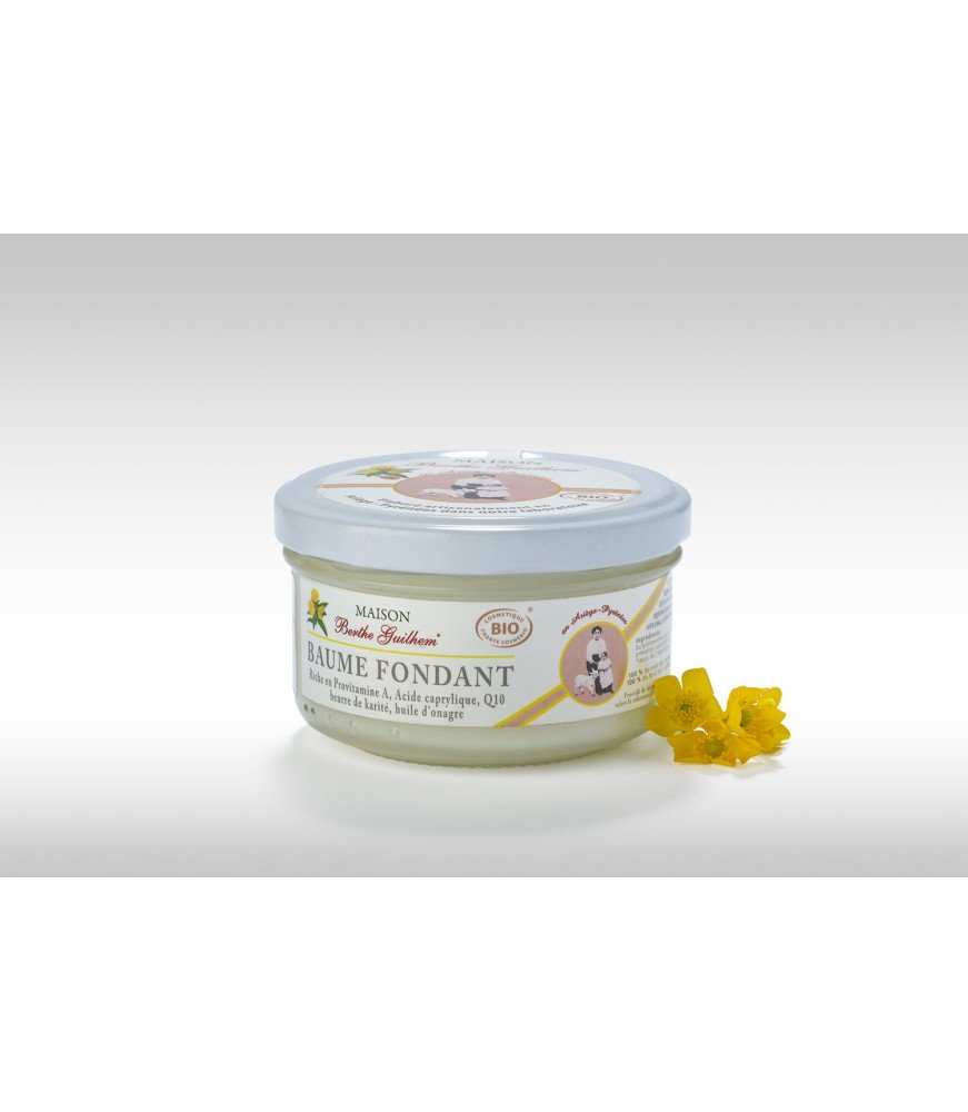Le Baume fondant ou baume du Jardinier de la Maison Berthe Guilhem : ce baume a longtemps été utilisé, comme son nom l’indique, par les jardiniers qui après de longues journées de travail avaient les mains et les pieds secs, voire avec des crevasses. Chez Berthe Guilhem, nous avons souhaité réutiliser cette recette ancestrale pour nourrir et réparer durablement votre peau sèche.